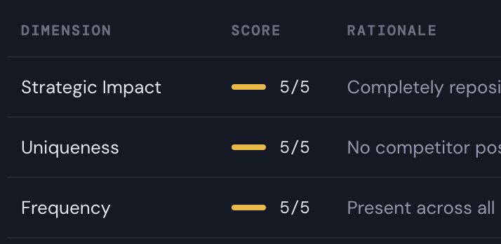And finally, it scores the insight. Six dimensions including strategic impact and uniqueness, thirty points max. That score is what lets you walk into a cross-functional meeting and say “the score is 28 out of 30. That's why we're leading with it. Because customers told us.”